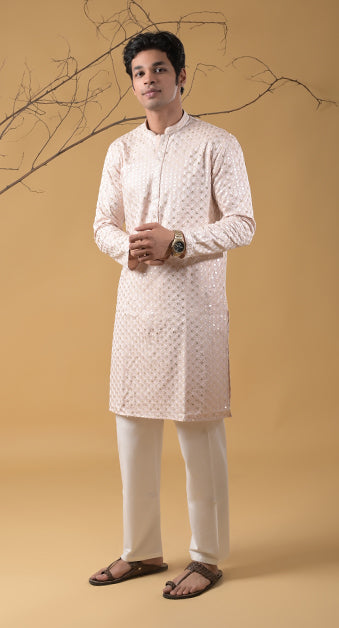 Light Peach Embroidered Cotton Kurta-Pyjama Set for Men