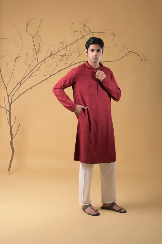 Maroon Self Embroidered Cotton Kurta-Pyjama set for Men