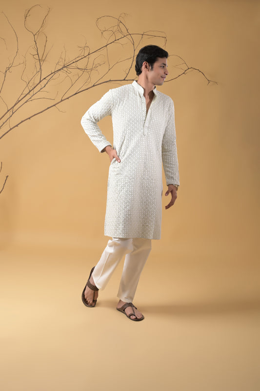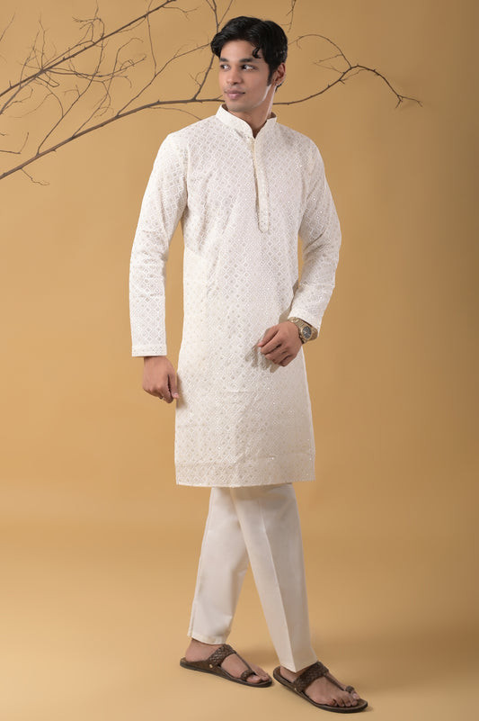 Off-White Self-Embroidered Cotton Kurta-Pyjama Set for Men