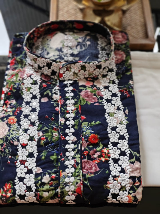Navy Blue, White Thread Embroidery with Sequins Highlights, Floral cotton kurta pajama set
